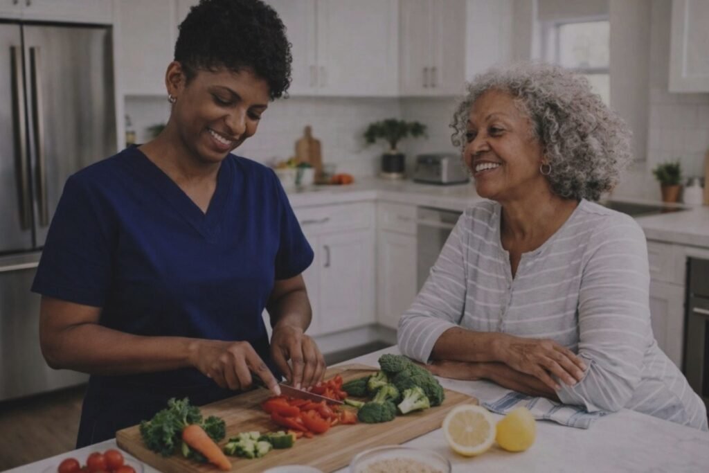 Planning and preparing nutritious meals based on preferences and dietary needs to support health, energy, and daily wellness in a safe home environment.